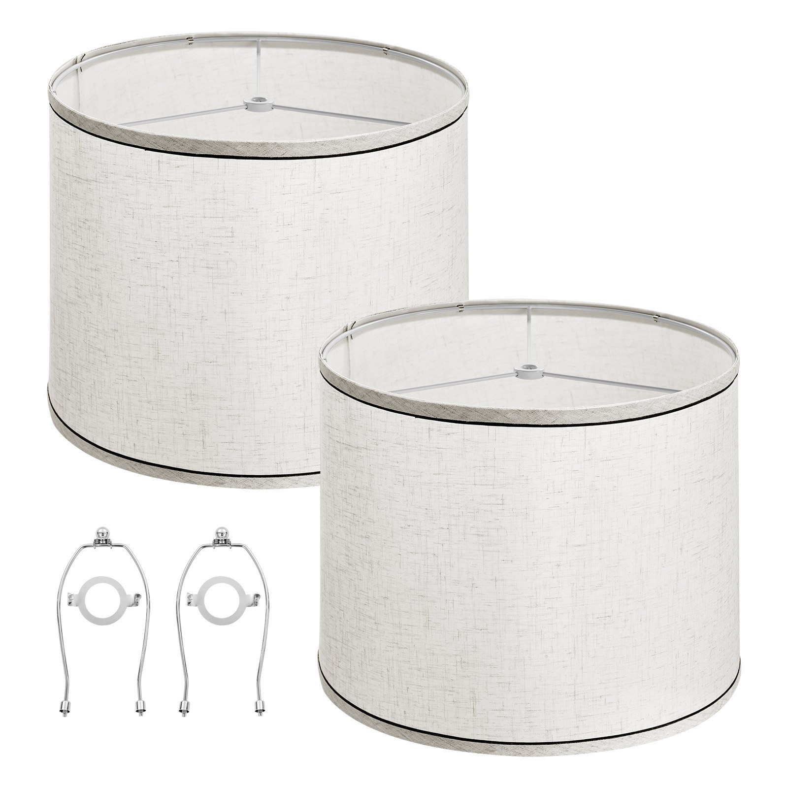 This lamp shade set includes two fabric drum lampshades designed for table or floor lamps. Each shade features a spider fitter for compatibility with harp-supported lamp bases.
